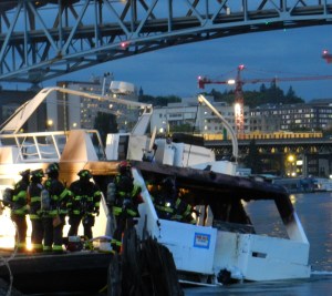 June 2, 2012 – Saturday – Seatttle Fire crews were dispatched to what began as a Boat under 50 feet Fire Shore at approximately 4:25pm at 2301 Northlake Way. Citizens nearby indicated a fast moving boat came flying through the area creating a huge wake causing the boat to catch on fire. Stunned onlookers described watching the speed boat being chased down by several local boaters.