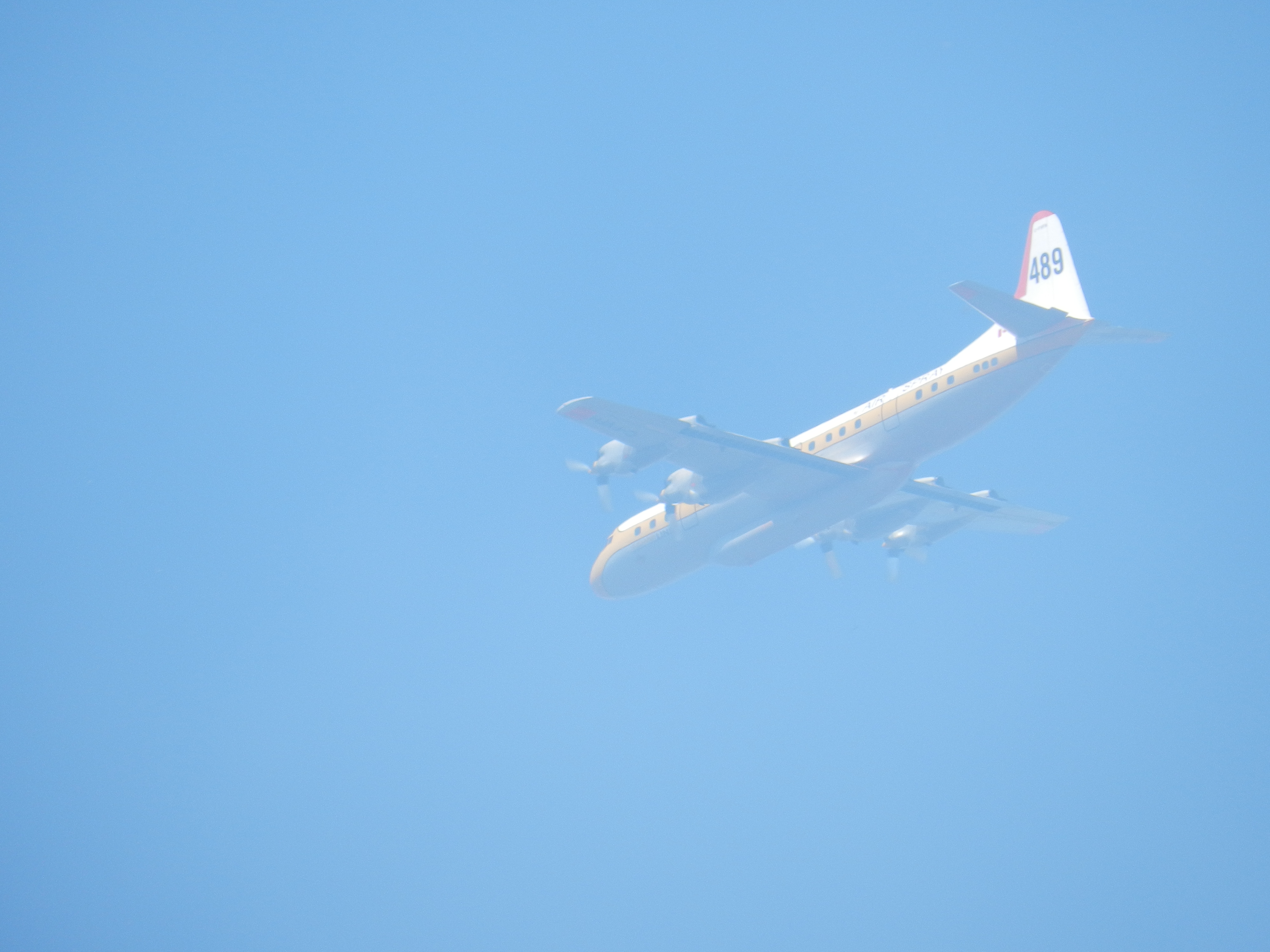 A Tanker came in with fire retardant on board. An amazing picture of the plane just above our heads or so it seems. At one time or another there appeared to be three (3) Helitacts with water buckets and two (2) Tankers with retardant trying to catch the fire.