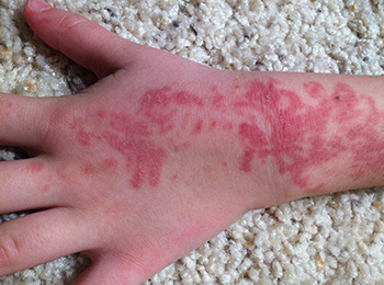 Temporary Tattoos Are Not Risk Free! A group of friends compare their temporary tattoos. The smallest hand (top right) belongs to a five-year-old who developed severe reddening (bottom) where the tattoo was placed. (Photos used with permission, by Keith Peterson.)