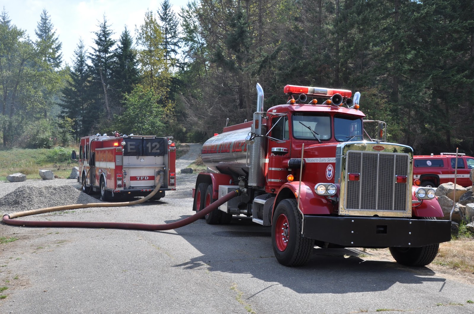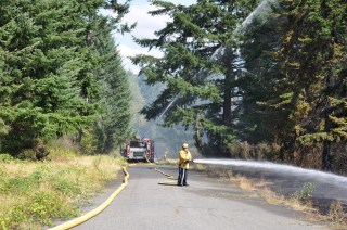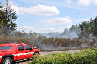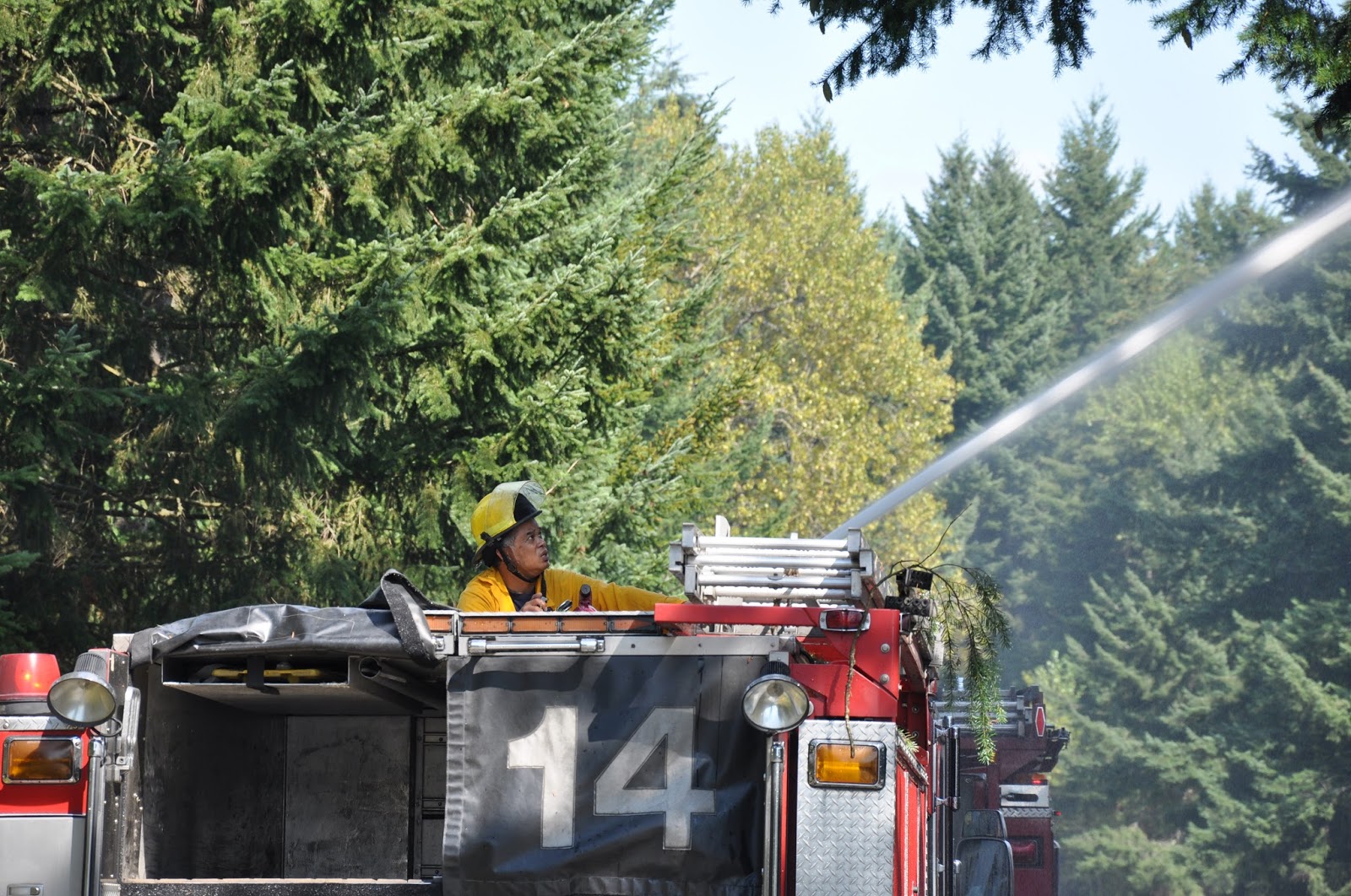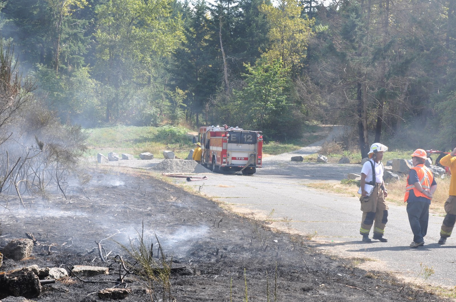 The first arriving companies found an approximately 250 x 350 fast moving brush fire in a once developed area behind the Salishan neighborhood and Lister Elementary on Tacoma’s Eastside. Crews surrounded the fire that was burning in tall grass, scotch broom bushes and trees using handlines and fire engine deck guns, eventually containing the blaze to an area of about 300 x 600. TFD’s water tender unit was brought in to assist with a establishing a water supply on one end of the scene and the natural fire breaks created by an old road network helped contain the fire.