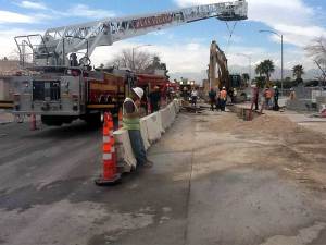 The department says that shortly before noon a worker was in a trench at a construction site near Vegas Drive and Michael Way, when an underground device failed and hit the worker in the back. He could not get out of the trench.