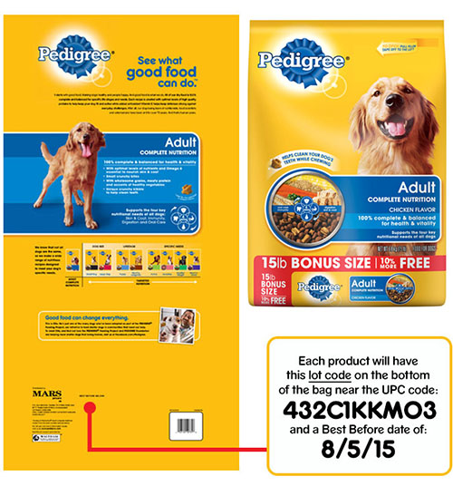 Only 15-pound bags of PEDIGREE® Adult Complete Nutrition dry dog food sold at Dollar General in Mississippi, Arkansas, Tennessee and Louisiana with the production code shown below are included in this voluntary recall. Each product will have a lot code printed on the back of the bag near the UPC code that reads 432C1KKM03 and a Best Before date of 8/5/15. No other PEDIGREE® products are affected, including any other variety of dry dog food, wet dog food or dog treats.