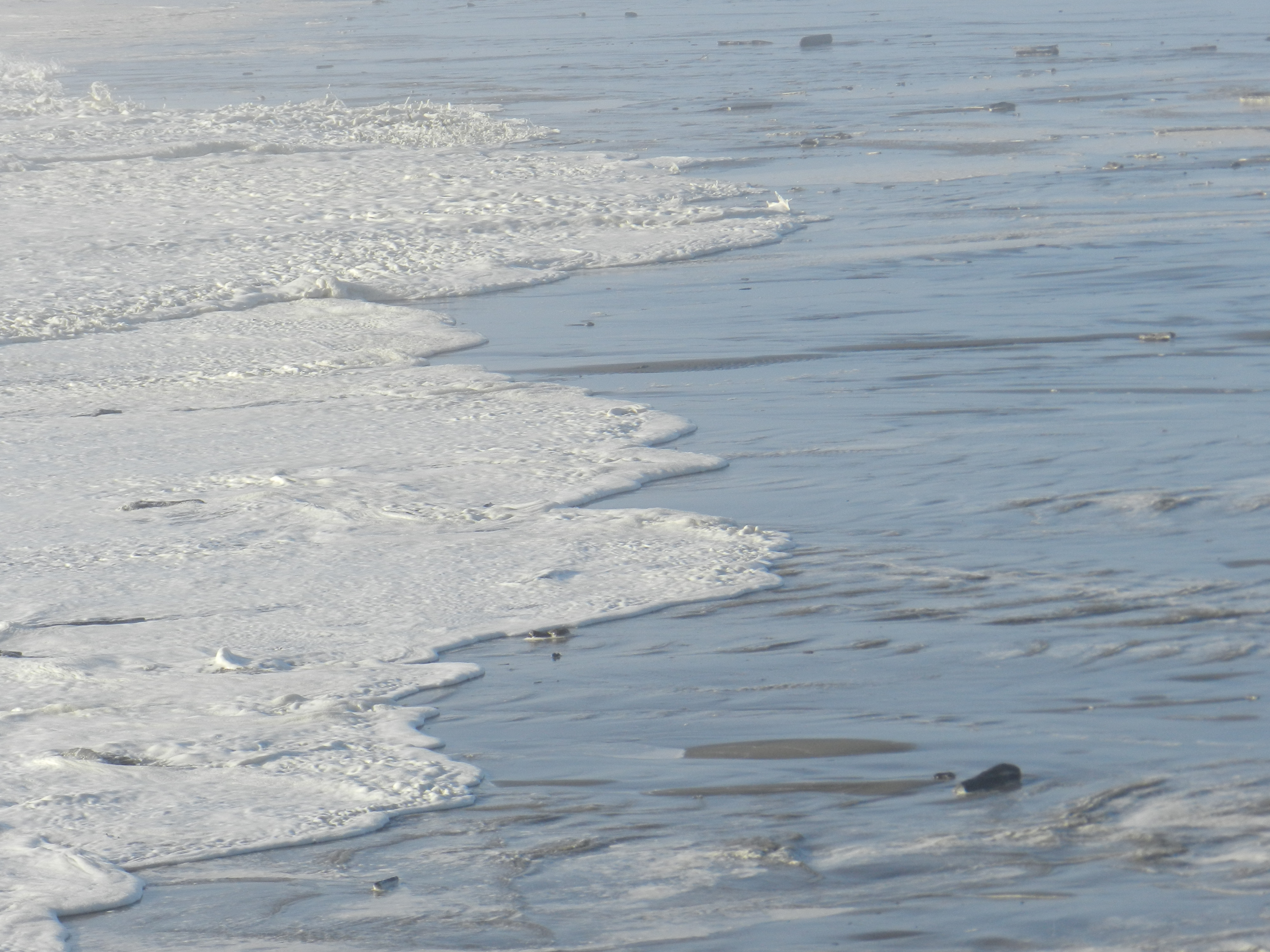 The photo above shows a “sneaker wave” coming up on shore catching this woman walking on the beach off-guard. Notice at the bottom of the photo foam from the ocean quickly approaching.