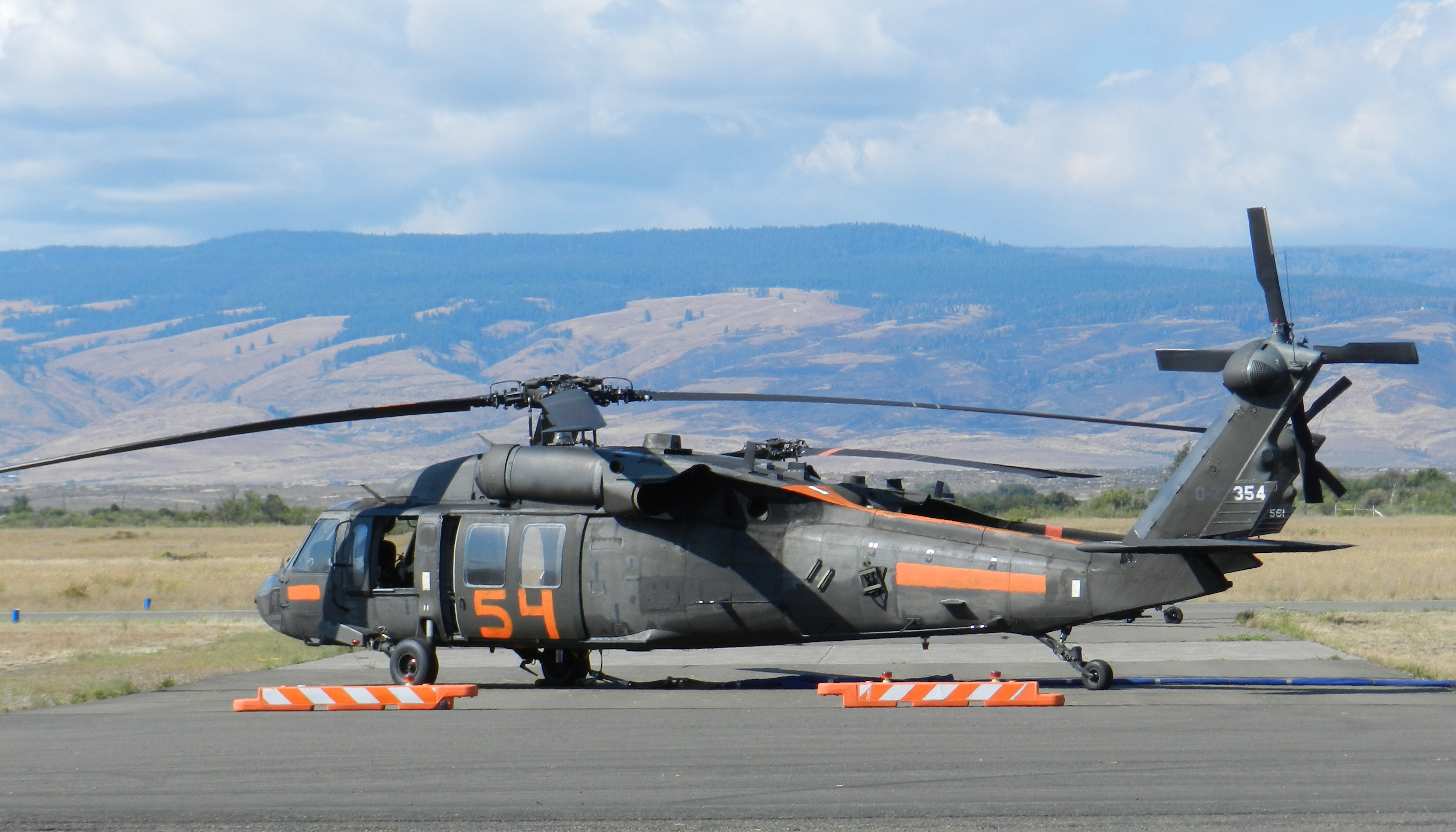 Two Blackhawks took off together both carrying water buckets to the fire. Great seeing so many on stand-by along with other craft working the incident.