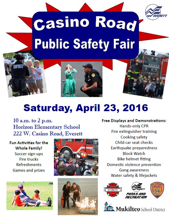The City of Everett and many partners, including the Fire Department will be host to the FREE Casino Road Public Safety Fair to be held this Saturday, April 23, 2016. The fun family-focused event will be located at Horizon Middle School at 222 W. Casino Road in Everett, Washington State from 10am – 2pm.