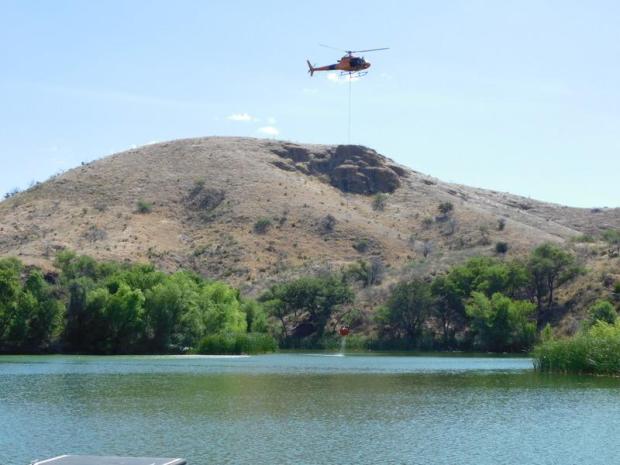 Helicopters are dipping out of the Pena Blanca Lake and dropping water over the fire to assist ground fire crews.