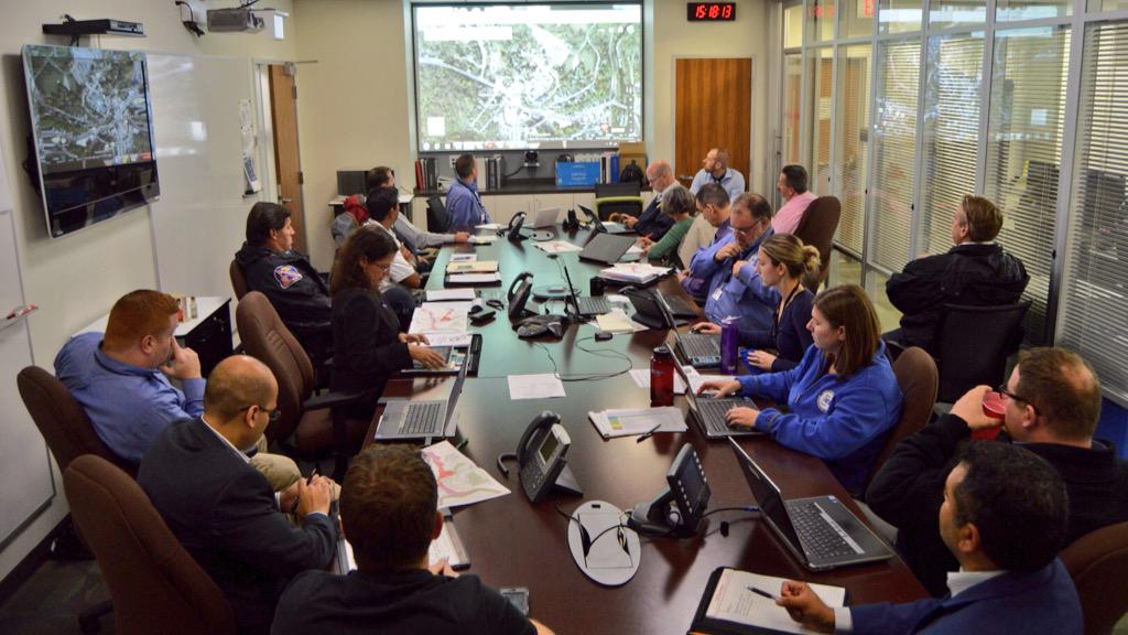 October 1 | Deputy Chief of Staff discusses plans how to handle possible flooding on Main Street at their local EOC. Photo Credit: Allan H Kittleman/Howard County Exec.