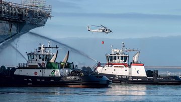 The Helicopter Sea Combat Squadron 3 has dropped more than 1,500 water bucket drops over the fire. It has been cooling the very large vessel and flight deck at one time enabling crews to enter the ship.