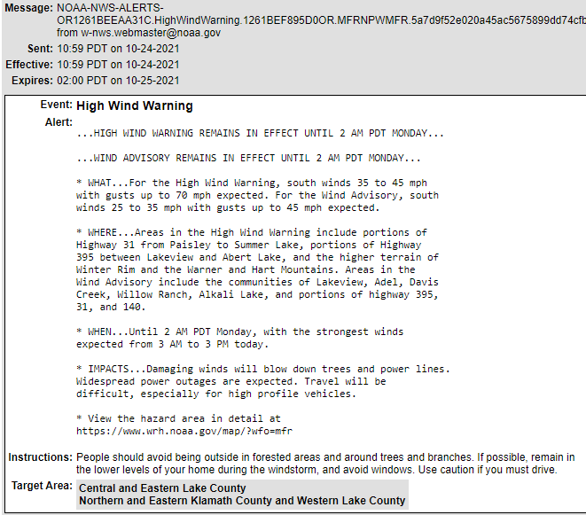 Central and Eastern Lake County, Northern and Eastern Klamath County and Western Lake County (OR) – WARNING
