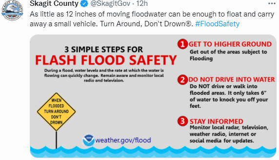 Skagit County put out an alert just before 1600 hours PT this afternoon, of anticipated major flooding in and around the town of Hamilton into Monday evening. If you care for livestock that may be impacted by flooding, at that time was to find higher ground. Preparedness Tips visit ready.gov/pets. (1352 PT).
