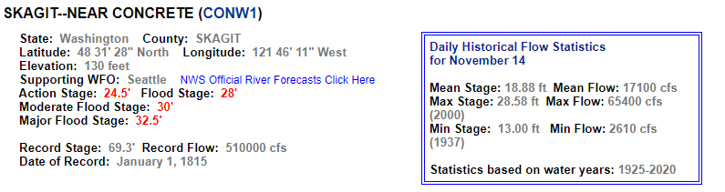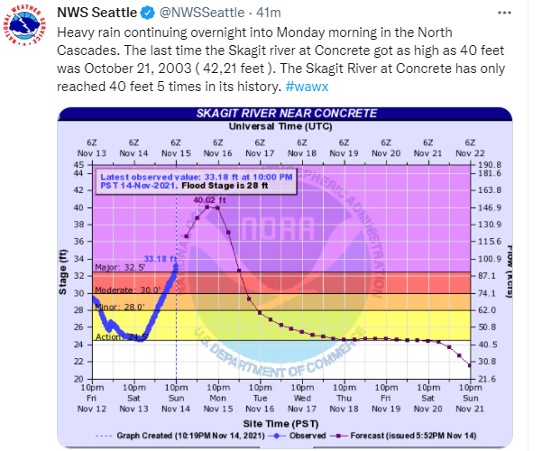 The NWS Seattle says at 40-feet, the Skagit River will cause severe near record flooding from Rockport downstream through Sedro Woolley. Flood water will inundate and damage roads, farms, businesses, and residential areas, especially Cape Horn, Hamilton, and Thunderbird. Levees east of Sedro Woolley may also be damaged.