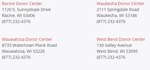 Waukesha American Red Cross – 2220 Silvernail Rd, Pewaukee, WI. 1-800-RED-CROSS. https://www.redcrossblood.org/local-homepage/location/waukesha-american-red-cross.html?fbclid=IwAR2YBfv5Ajt4uRZ2jI-IJXS-JZ-LNfUdOWV5zUdxYv_bDlPYdz26ZR1MLnM Make an appointment on their website.