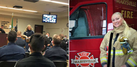 Move Ups | Firefighter Hayley Peterson, wife and mother is being recognized by her Fire Department for graduating from the Snohomish County Fire Training Center after being promoted to a Career Firefighter in June of this year. She was awarded the Training Academy’s Lion’s Heart Award, for her grit, determination and perseverance in reaching her goals.