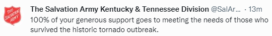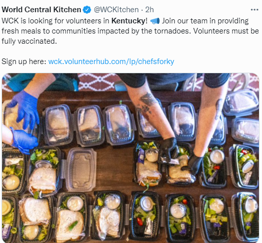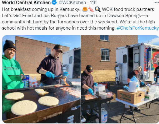 We are seeing so much love & outpouring of support in Kentucky…Melisa was in Dawson Springs using her Christmas savings to run this food truck to feed tornado survivors! Of course, we told her that @WCKitchenwill cover all costs & she’s now part of WCK serving her community!” – World Central Kitchen
