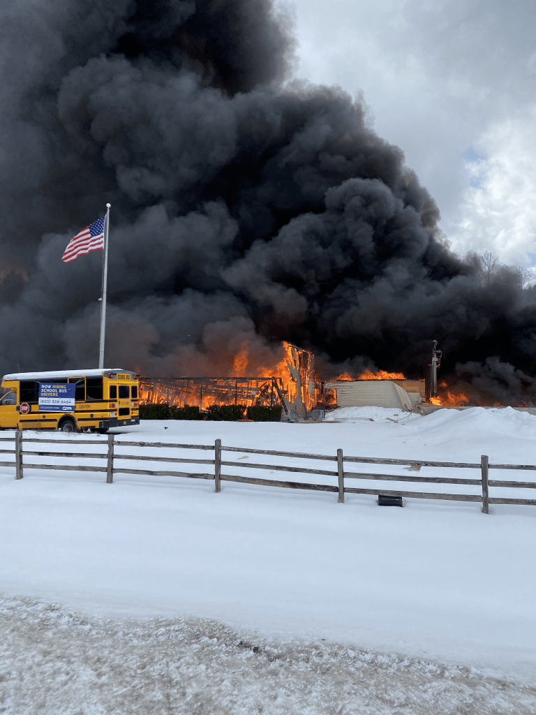 BRADFORD, NEW HAMPSHIRE — Fire crews were dispatched to a building fire that reached up to five alarms today, after receiving multiple 9-1-1 calls reporting a building explosion at the Student Transportation of American Bus Company (formerly Valley Transportation).