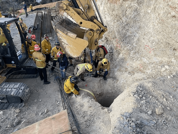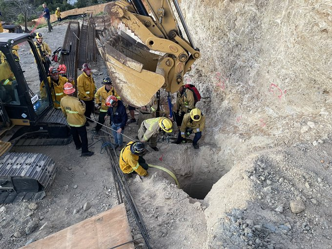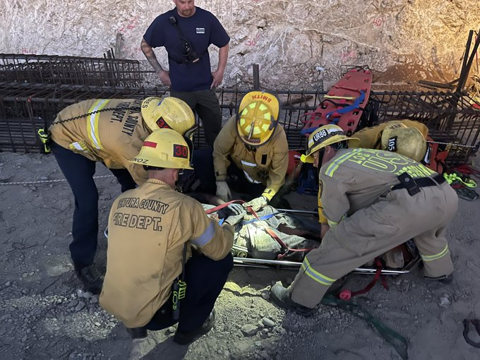 This evening, Firefighters with the Ventura County Fire Department and the Los Angeles City Fire Department were on the scene of a construction site where a man had fallen 25-feet down a hole in Bell Cyn. A rope rescue was established and firefighters immediately began the slow painstaking process of being lowered into the opening to rig up the man to safety.