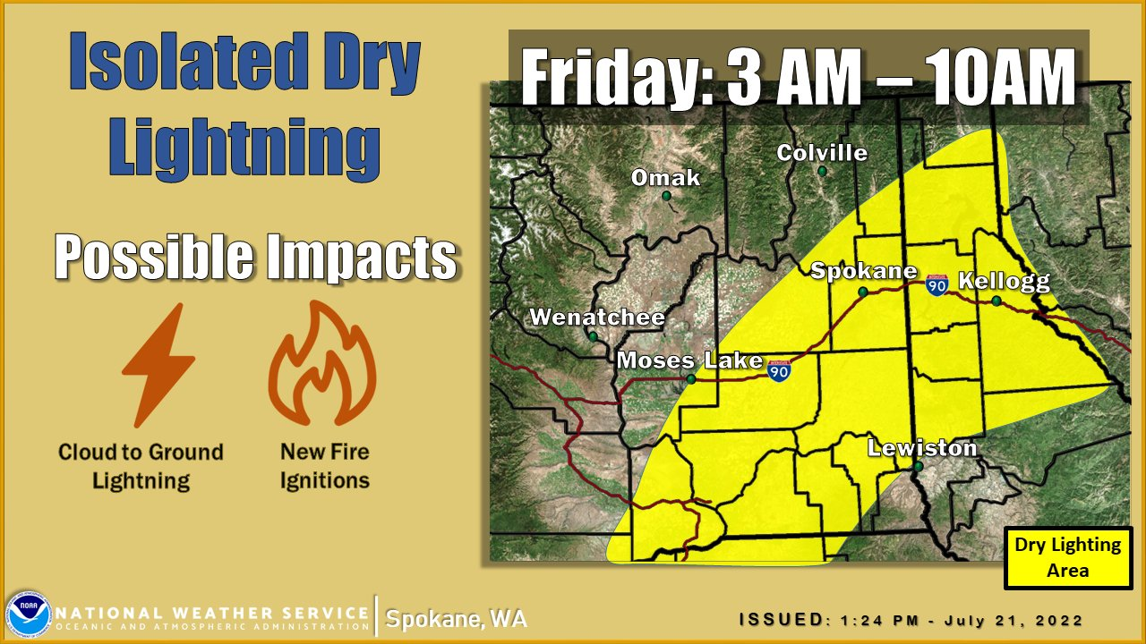 Fire Alert! | The weather forecasters are predicting possible isolated dry lightning Friday morning from 0300 hours to 1000 hours. The Spokane Valley Fire Department is asking you to report any visible smoke columns or new starts by calling 911 as soon as it is seen and safe to do so.