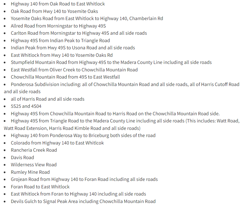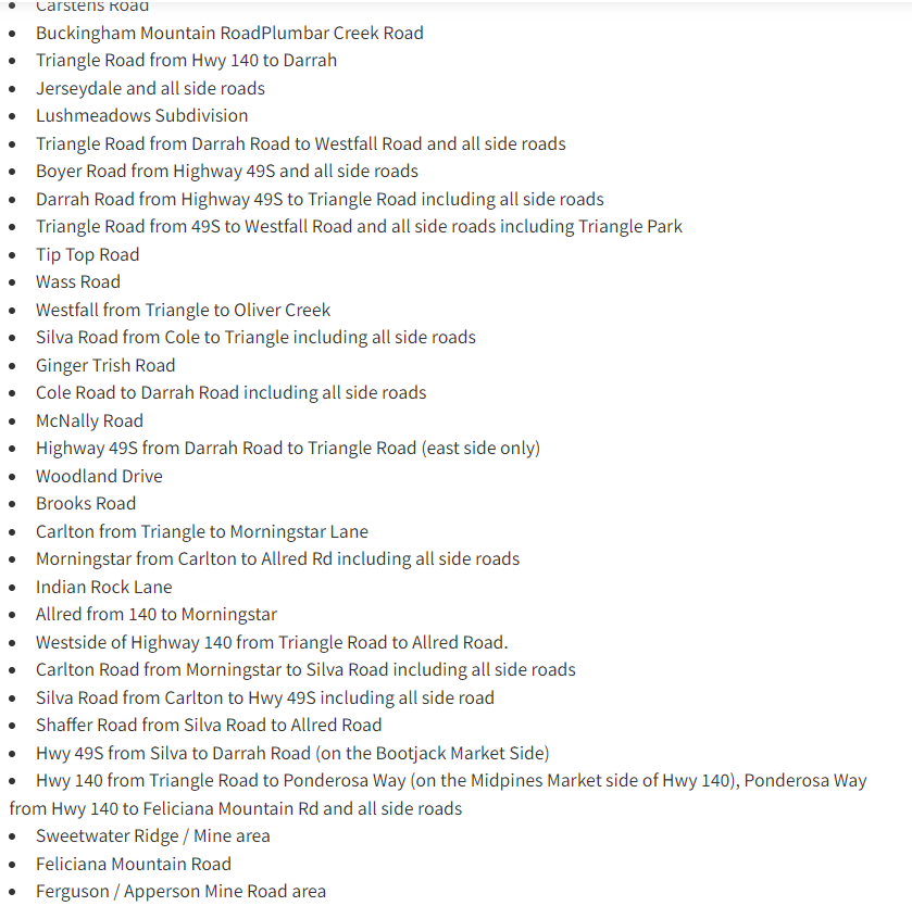 ROAD CLOSURES: Highway 140 from Highway 49N to Ponderosa WayCarstens Road, Triangle Road from Highway 140 to Highway 49 and all side roadsJerseydale RoadSilva Road from Cole Road to Triangle RoadWass RoadTip Top RoadDarrah at 49Westfall from Triangle to Oliver CreekMcNally RoadWoodland DriveBrooks RoadBootjack LaneCole RoadCarlton from Triangle to MorningstarAllred from Highway 140 to MorningstarMorningstar from Carlton to Allred including all side roadsPonderosa Way including all side roadsSilva Road including all side roads.