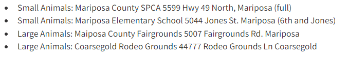 EVACUATION SHELTER: Mariposa Elementary School, 5044 Jones Street, Mariposa, CA. (Hoomans and their small pets)