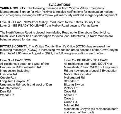 Evacuation orders were issued for 50 homes and/or structures in both Kittitas and Yakima Counties.