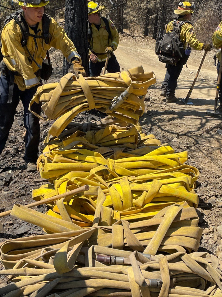 KLAMATH NATIONAL FOREST – Hard work is necessary to get the job done during a wildfire incident. Here are CAL FIRE firefighters hiking in steep and rugged terrain carrying up a large number of hoses back to their fire cache.