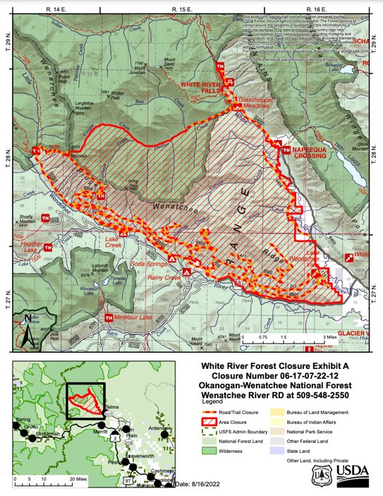 The WHITE RIVER FIRE ignited by lightning is burning in the Sears Creek area of the White River drainage, about 14 miles northwest of Plain and 33 miles northwest of Leavenworth, Washington State, which started on August 12, 2022.
