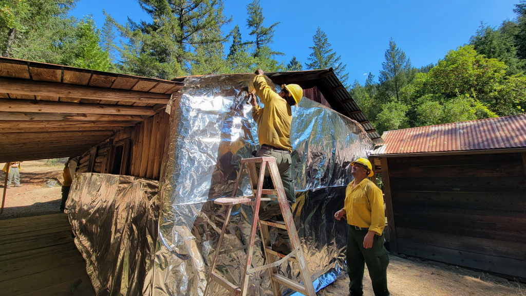 Pic: The wrapping of the Whiskey Cabin – protects it from wildfire from burning it down. Takes a little bit for firefighters to completely wrap in special material.