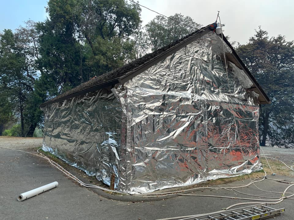 Gig Harbor Fire & Medic One: “Update from one of our Wildland Structure Protection Specialists deployed to assist on the fire in Southern Oregon. As the fire threatened structures, our assignment was to protect the Smullin Visitor Center in Rand on the Rogue River. We cleared the brush around the structure, installed sprinklers, and wrapped some buildings. The pictured is a historic boat house building in the 1930s. We also worked with agency resources advisors to help plan out what we need to protect and what has historical significance.” – 9/2/2022 1357 PT