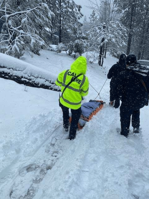 CAL FIRE Nevada-Yuba-Placer Unit | On March 2, Fire and EMS crews used a rescue sled also known as a Sked, to transport a non-ambulatory (cannot walk out on their own two feet) from their house to an awaiting ambulance. Challenges occurred when they had to step onto snow-covered steep driveways and safely over mounds of snow.
