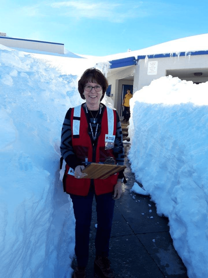 Faces behind the Response | Volunteers are responding to all areas where they are needed. Here is one of the many volunteers working to help residents in a community. Check out the height of the snow bank. | Photo Credit: ARC
