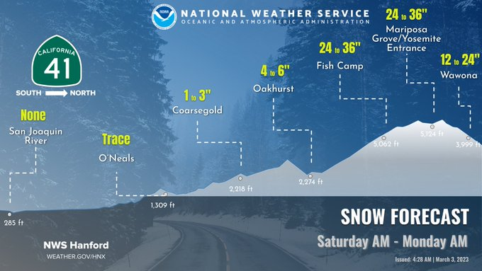 Weather Forecast from Hanford Weather Station | Another round of snow has been predicted to impact the State yet again. On March 3rd, weather forecasters: “A storm system will be responsible for snow in the Sierra Nevada and adjacent foothills Saturday afternoon through Sunday night. Here are elevation profile graphics for accumulating snow along Highway 41, Highway 140, and Highway 198.”