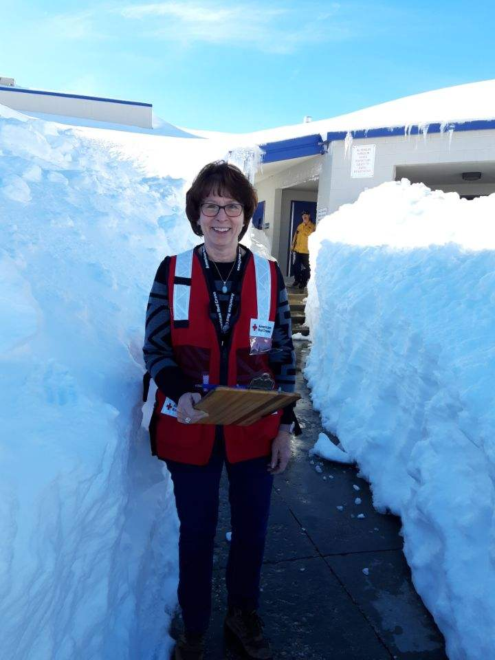 Faces behind the Response | Volunteers are responding to all areas where they are needed. Here is one of the many volunteers working to help residents in a community. Check out the height of the snow bank. | Photo Credit: ARC