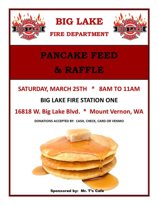 March 11, 2023 — The Big Lake Fire Department will be hosting a Pancake Feed and Raffle event on Saturday, March 25, 2023, from 8-11 at Fire Station 1 located at 16818 West Big Lake Boulevard in Mount Vernon.