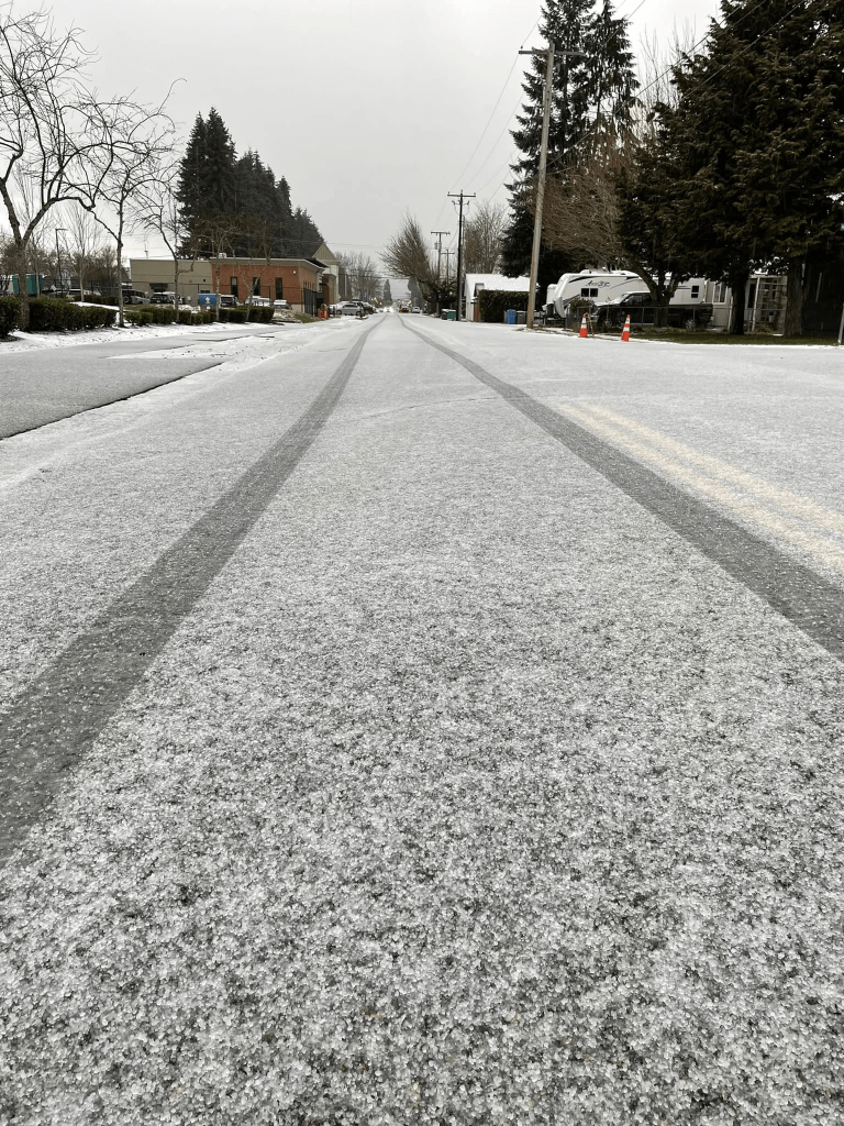 March 8, 2023 — A crazy and powerful thunderstorm passed over the Orting area and left a heavy amount of hail on the roadway, causing dangerous driving conditions for firefighters and area drivers.