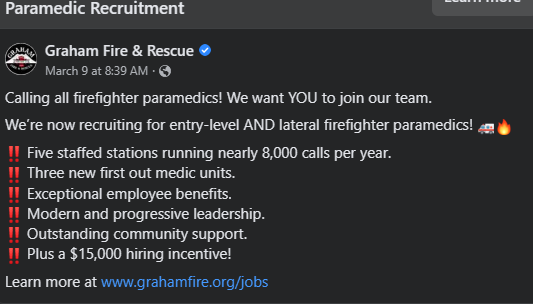 Calling all firefighter paramedics– Graham Fire & Rescue wants you to join their team. They are recruiting for entry-level and lateral firefighter paramedics. Find out more at www.grahamfire.org/jobs