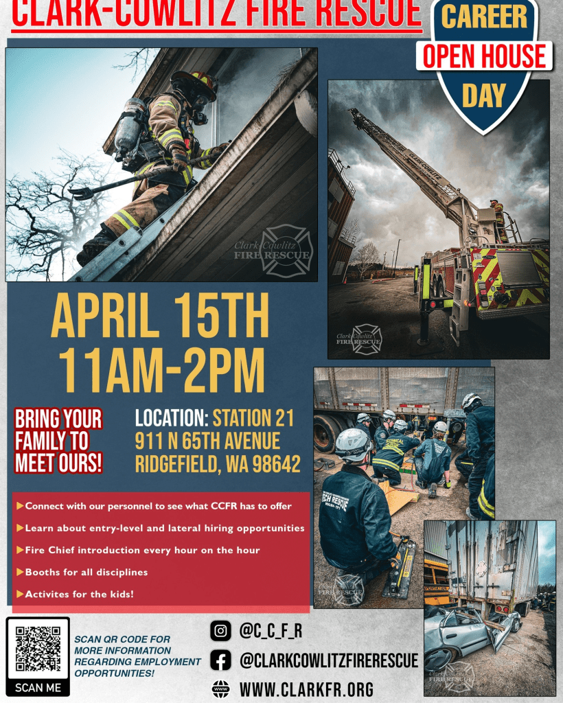 Clark-Cowlitz Fire Rescue (CCFR) is excited to announce our upcoming open house and career day on April 15th, 2023, from 11:00 AM to 2:00 PM at our Headquarters, Station 21, located at 911 N. 65th Ave, Ridgefield, Washington.