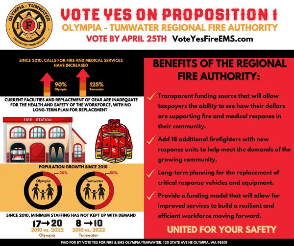 Olympia Firefighters are asking voters on April 25th to say YES vote on Proposition 1, which would be to allow the regionalization of Olympia and Tumwater Fire Departments to merge into one regional fire authority.