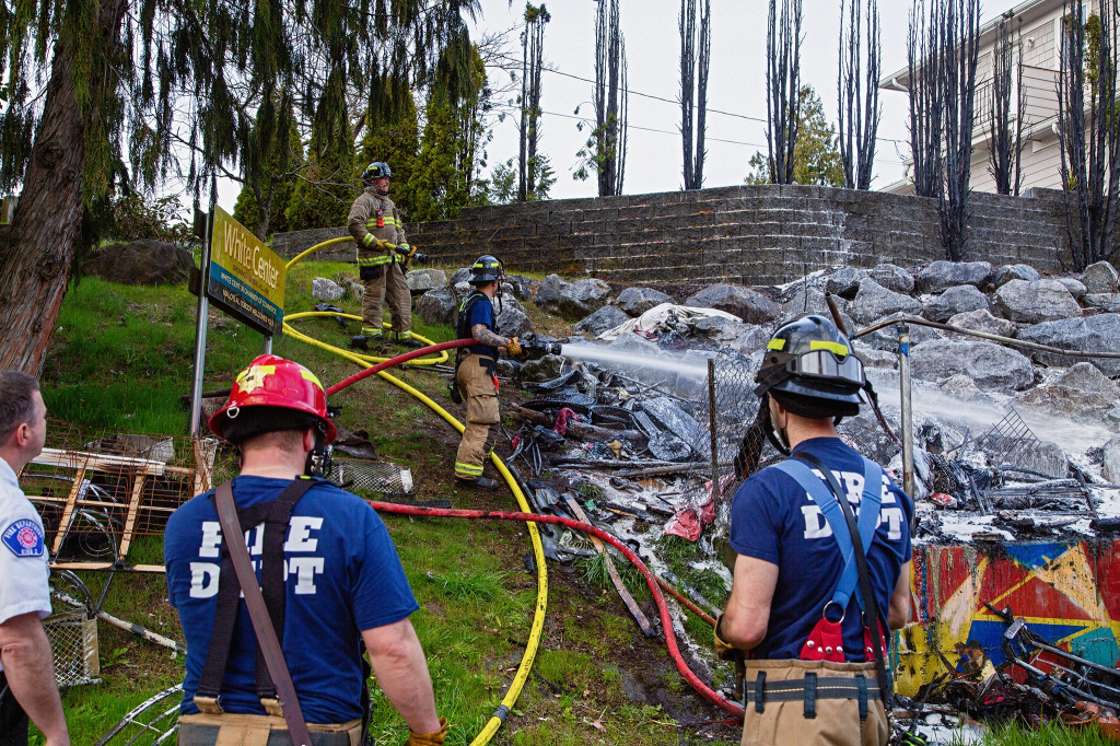 On Wednesday, April 5th, firefighters with the King County Fire District #2 were dispatched to a structure fire at 8th and Roxbuury in Burien, where they arrived at a fully engulfed homeless encampment on the hill below a house.