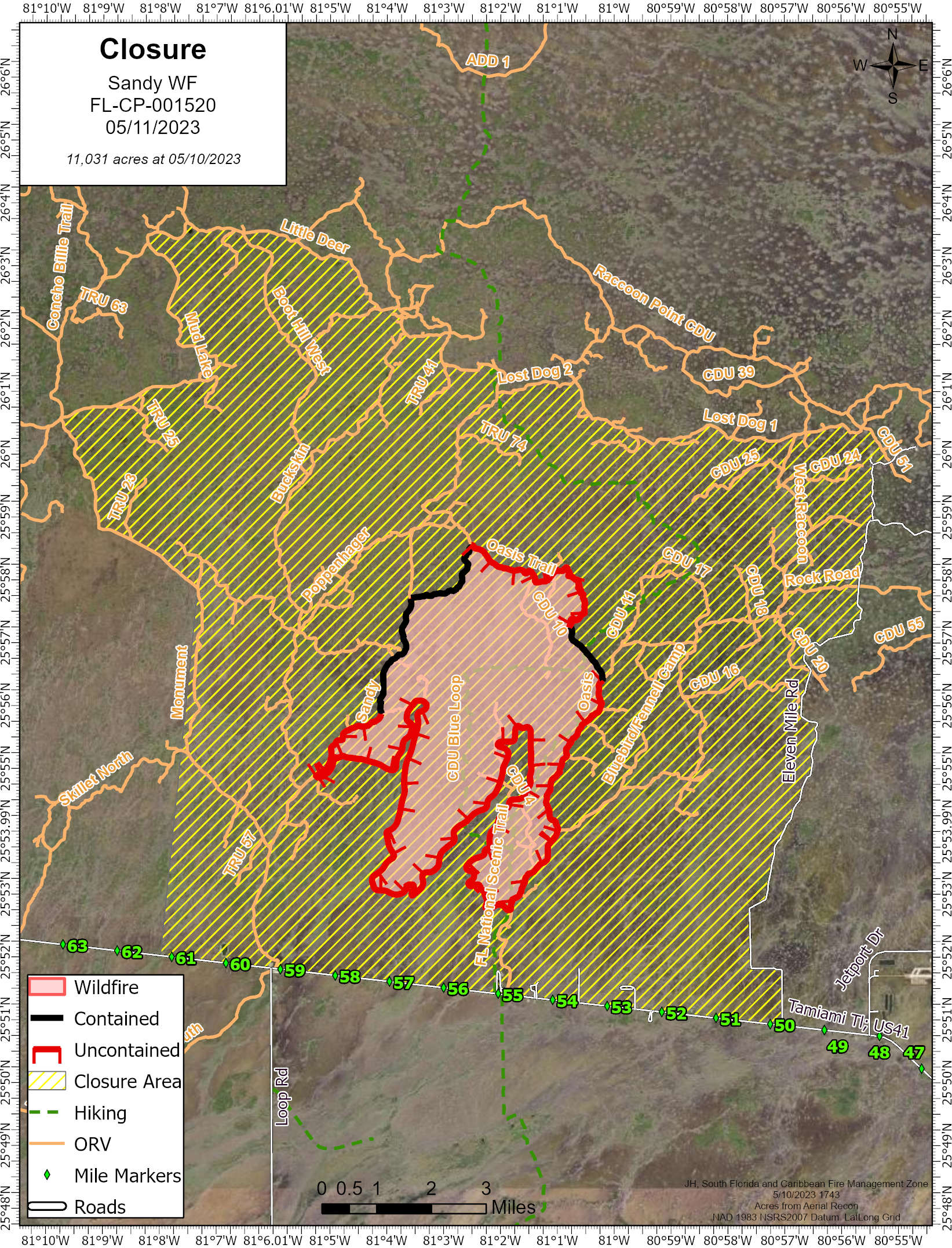 The SANDY FIRE is located about 22 miles northeast of Carnestown in the Big Cypress National Preserve (National Park Service) in the southern portion of Collier County, in the State of Florida.