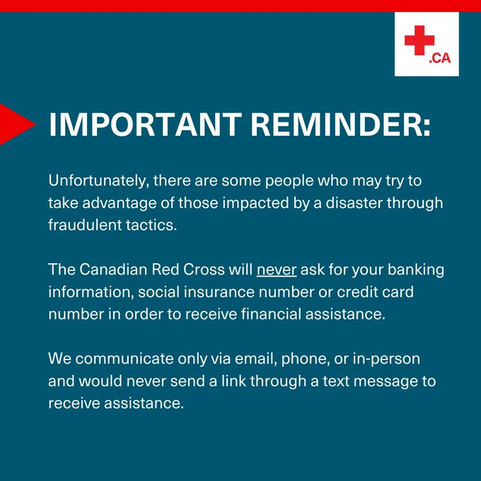 - Call the Red Cross at 800-863-6582 between the hours of 0800 – 2000 hours ADT, 7 days a week, OR online at redcross.ca/AtlanticWildfires