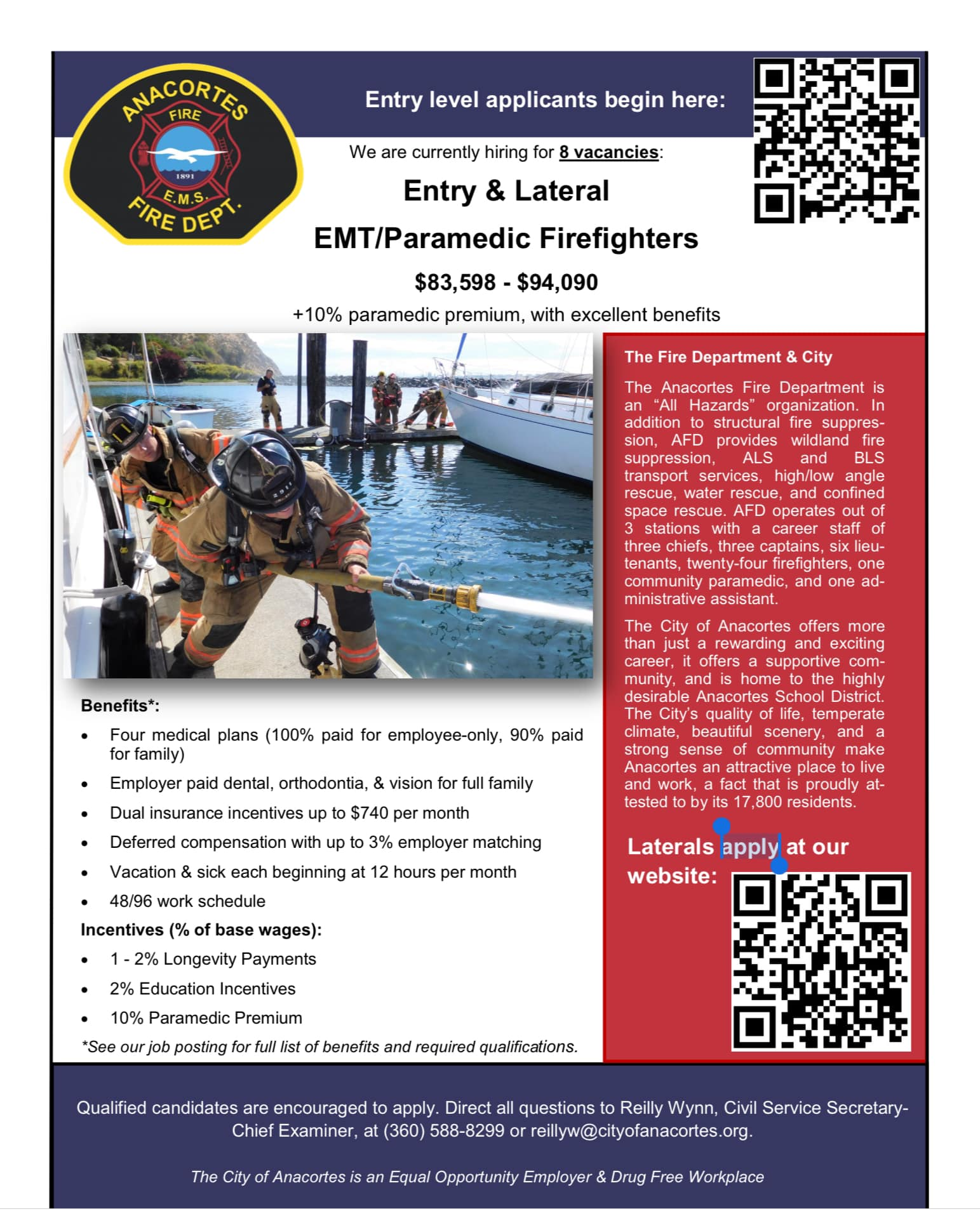 - Lateral Firefighter / EMT with pay starting at 8,077 – 8,975 per month