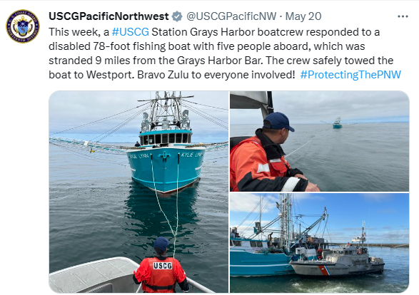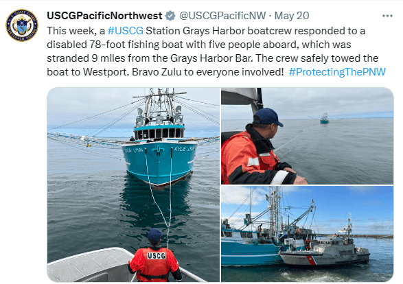 May 20, 2023 – A stranded boat in Grays Harbor is assisted by the US Coast Guard PNW.