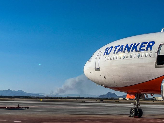 (R) 10 Tanker sits on the tarmac ready to be deployed as the Diamond Fire can be seen in the distance. | Photo Credit: 10_Tanker Air Carrier