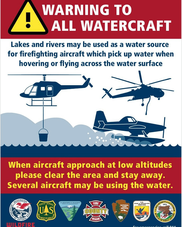Our first reminder that our main area lakes (Spokane/Long, Deer, & Loon) are used for aircraft that help us control wildland fires. The fire may not be in our Fire District but they may still use them as water sources.