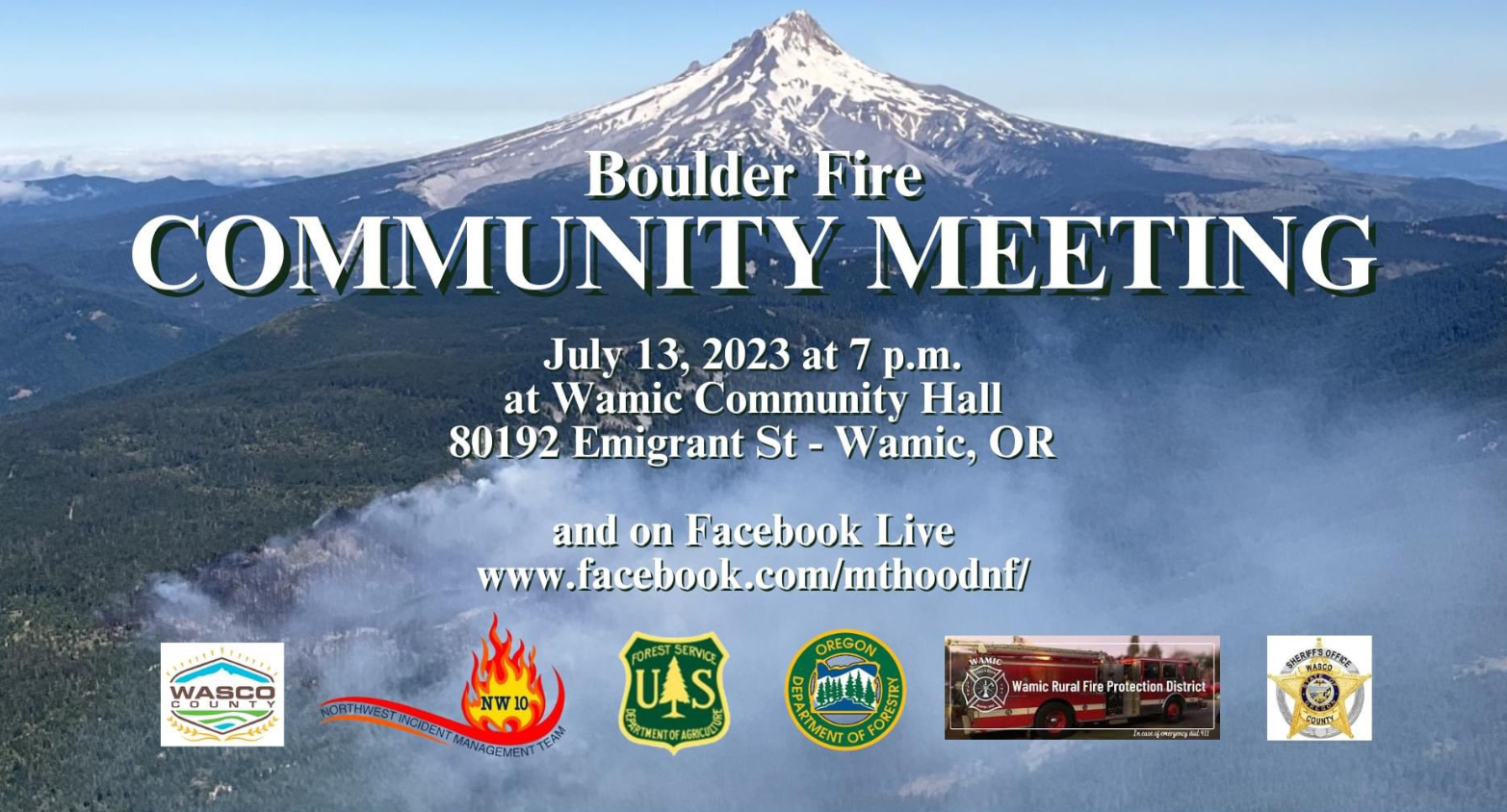 FIRE COMMUNITY MEETING TONIGHT AT 1900 HOURS PT: Northwest Incident Command Team 10 is hosting a Boulder Fire Community Meeting on Thursday, 7/13 at 7pm in Wamic, OR, and virtually via Facebook Live. Remember – you don’t need a FB account to watch the live event.