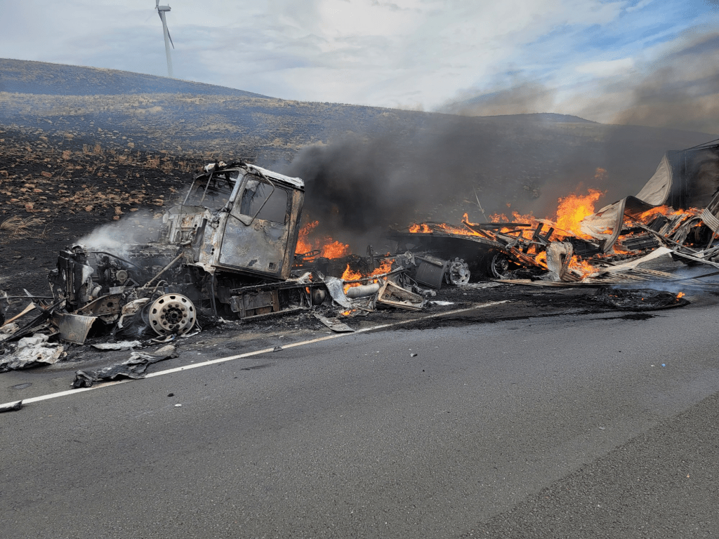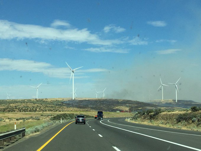 September 9, 2018: A fire burns near the Ryegrass Rest Area, west of Vantage in Kittitas County, which is slowing down westbound I-90 traffic.