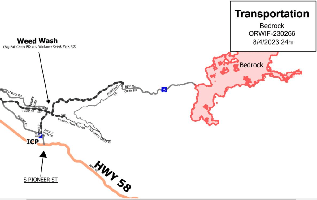(L) Map Credit: Bedrock Fire 2023 Facebook Page