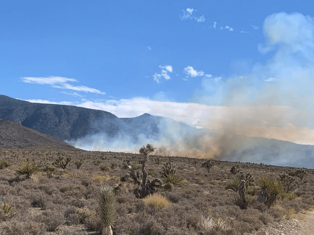 A wildfire named the MT. STIRLING FIRE is thought to be sparked by lightning on Wednesday, August 9, 2023, at 1529 hours is located off Wheeler Peak Road, about three-to-four miles off Hwy 95 and Forest Service Road 565C in the area of Mt. Stirling in Indian Springs, Nevada (USA).
