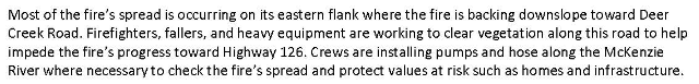 There have been about 11,174 acres of timber destroyed and thankfully, NO structures have been taken in the area. However, there are still threats to the community of McKenzie Bridge, energy, and communication infrastructure.