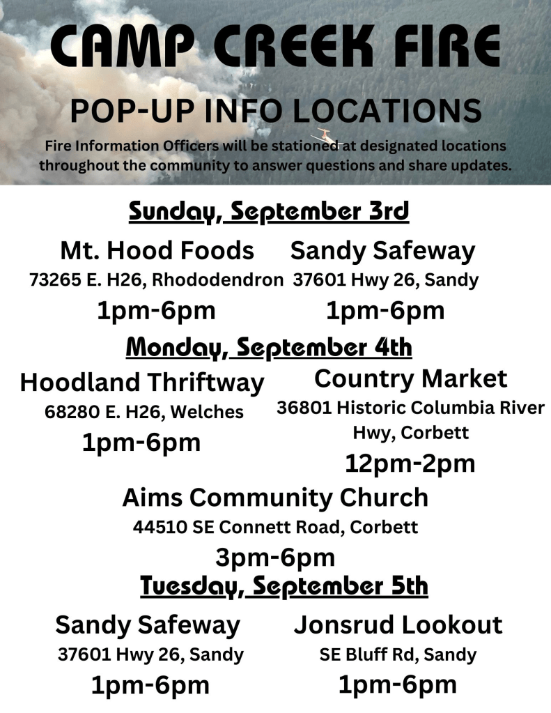 Today, fire information officers will be stationed at Hoodland Thriftway in Welches, OR., from 1 – 6 p.m., Country Market in Corbett, OR, from 12 – 2 p.m., and Aims Community Church in Aims, OR, from 3 – 6 p.m. to provide fire information and answer questions in-person.